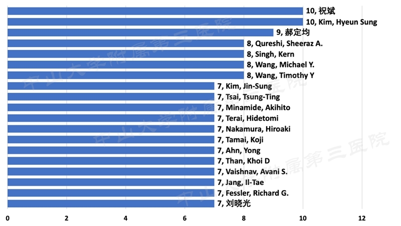发表最多的杂志为WORLD NEUROSURGERY,2-5位依次为OPERATIVE NEUROSURGERY,EUROPEAN SPINE JOURNAL,GLOBAL SPINE JOURNAL,ORTHOPAEDIC SURGERY。