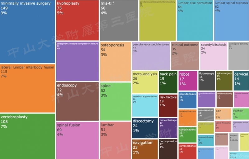 下图是发表论文关键词的Treemap图,显示了各关键词的比例由高到低排列,从中可以看出哪些疾病、哪种手术方式研究得比较热门。