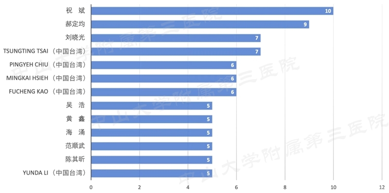 我国发表论文前10的作者均来自于上述机构。其中前三位为祝斌、郝定均及刘晓光。