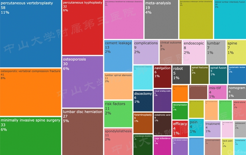 下图为发表论文关键词的Treemap图,显示了各关键词的比例,从中可以看出哪些疾病、哪种手术方式研究得比较热门。居于首位的关键词是PVP。