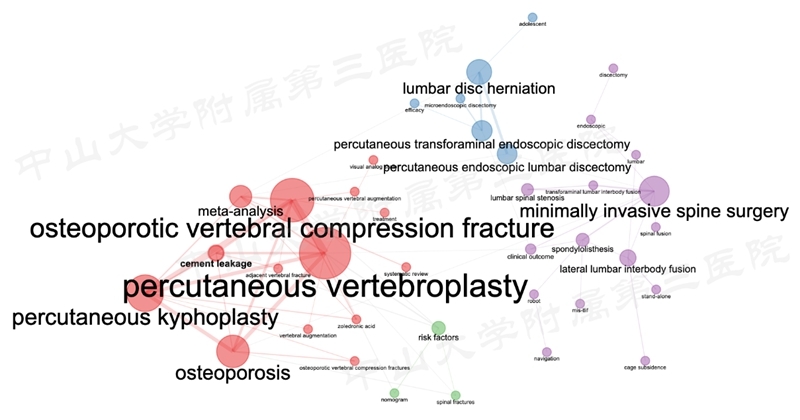 关键词云图对热点看得更为清晰,研究最为热门的疾病为骨质疏松椎体骨折,其次为腰椎间盘突出症,腰椎管狭窄症及腰椎滑脱症,研究还是以退行性疾病为主,肿瘤、感染、畸形的疾病在微创领域研究较少。重点研究的部位为腰椎。