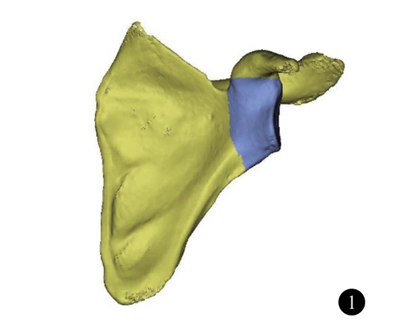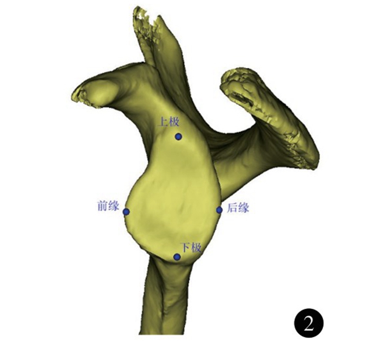 传统尸体解剖研究可用于测量肩胛骨表面解剖学参数,但难以精确描述、测量肩胛盂体部。随着电子计算机技术的不断发展和三维重建技术的进步,对肩胛盂体部结构的研究有了新的方法。Kwon等通过肩胛骨尸体骨及CT研究,证实CT三维重建能准确、定量的测量肩胛骨解剖学结构,认为CT重建能准确的反应肩胛骨的真实形态,对肩胛骨标本的直接测量所得结果与其相对应的三维CT测量结果具有很强的相关性。