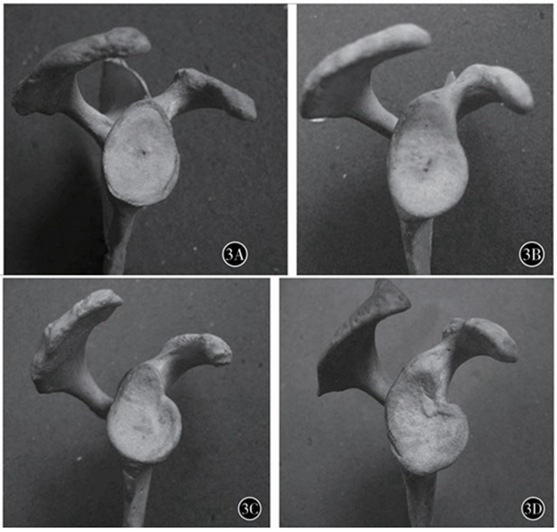肩胛骨位于胸廓上方两侧偏后,紧贴胸后壁,与其构成类似关节的结构,称之为肩胛胸壁关节。肩关节活动时,肩胛骨沿胸壁活动,配合盂肱关节,完成肩关节上举,是肩关节的重要组成,并通过盂肱关节和肩锁关节将上肢连接于躯干上。肩胛盂作为盂肱关节的组成部分,深度较浅,形态不规则,近似梨形;下半部分较上半部分大,比例约为1∶0.8±0.1。众多研究测量了肩胛盂表面解剖学参数,其中肩胛盂上下径为肩胛盂最高点至最低的距离(图2);其均值男女分别为33.6~37.5mm和29.4~33.8mm。肩胛盂前后径为位于与肩胛盂上下轴垂直平面的肩胛盂前后的最大距离;其均值分别为24.9~28.6mm和21.3~23.7mm。肩胛盂上下径、前后径存在显著的性别差异,男性肩胛盂较女性大10%左右。肩胛盂形态在性别上也有不同,男性肩胛盂下部较圆,而女性为椭圆。Andrea等依据肩胛盂前缘切迹的形态将肩胛盂的形状分为4型(图3):0型(无切迹)、Ⅰ型(弧线型)、Ⅱ型(切迹型)、Ⅲ型(圆齿型)。男女均以Ⅰ型(弧线型)所占比例最高。肩胛盂前缘切迹在女性中出现的比例为80.4%;而男性中这一比例为57.6%。36.7%的女性切迹出现在顶部;而男性只有28.9%,两者差异有统计学意义。