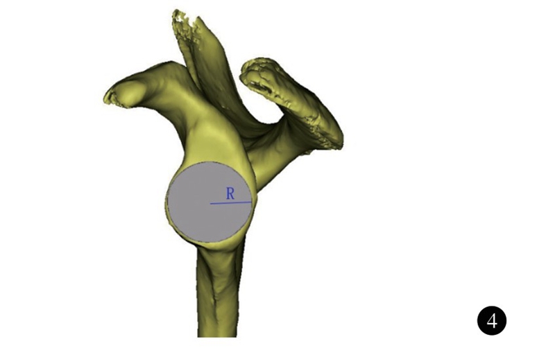 肩胛盂近似梨形,下半部分较上半部分大。在反式肩关节置换术中,肩胛盂侧假体安装在肩胛盂下部,因而肩胛盂下半部分的大小决定了假体的大小。韩国Ji等测量了本国肩胛盂下部的解剖学参数,其中肩胛盂下部半径男女分别为(17.1±2.1)mm和(15.4±1.6)mm,性别之间差异有统计学意义(图4)。