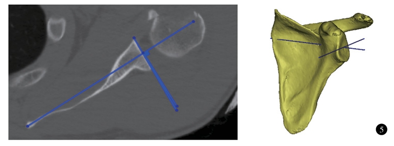 测量肩胛盂前后方向上的倾斜有多种方法。传统二维测量方法是获取患者的二维CT数据,做肩胛骨最内侧的点至肩胛盂中心的连线(friedman线),同时做肩胛盂前缘和后缘的连线(中关节线);中关节线和Friedman线垂线之间的夹角即为肩胛盂前后方向的倾斜角度(图5)。根据成角的方向,又分为前倾(anteversion)和后倾(retroversion)。这种测量方法被认为是测量肩胛盂前后方向的倾斜的金标准。但它没有设立坐标系,不是三维立体测量;肩胛骨的方向、冠状位或矢状位的旋转会影响测量的精度。最新文献建议应使用三维CT测量肩胛盂前后方向的倾斜。Kwon等以肩胛体最低点、肩胛盂中心和肩胛骨最内侧三点建立坐标系,并参考Friedman法测量肩胛盂前后倾(图5),发现三维CT能更精确评估测量肩胛盂前后方向的倾斜,具有更佳的可靠性。国外文献报道,正常人群三维CT测量肩胛盂前后方向的倾斜均值﹣4.5~2°;男女对比并未发现性别差异。汪华清等选取肩胛盂前后缘中点至肩胛骨内侧缘中点的连线作为参考线,测量了国人肩胛盂在前后方向上的倾斜,所得结果为(﹣0.03±4.66)°;其中男性为(1.20±4.87)°,趋于前倾;女性为(﹣1.84±3. 71)°,趋于后倾。与西方研究结果不同,男女性之间比较差异有统计学意义。