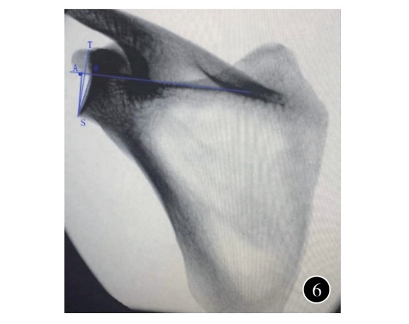 全肩关节成形角为肩胛盂最高点至最低点的连线与冈上窝底垂线的夹角;反肩关节成型角为肩胛盂下部连线与冈上窝底垂线之间的夹角