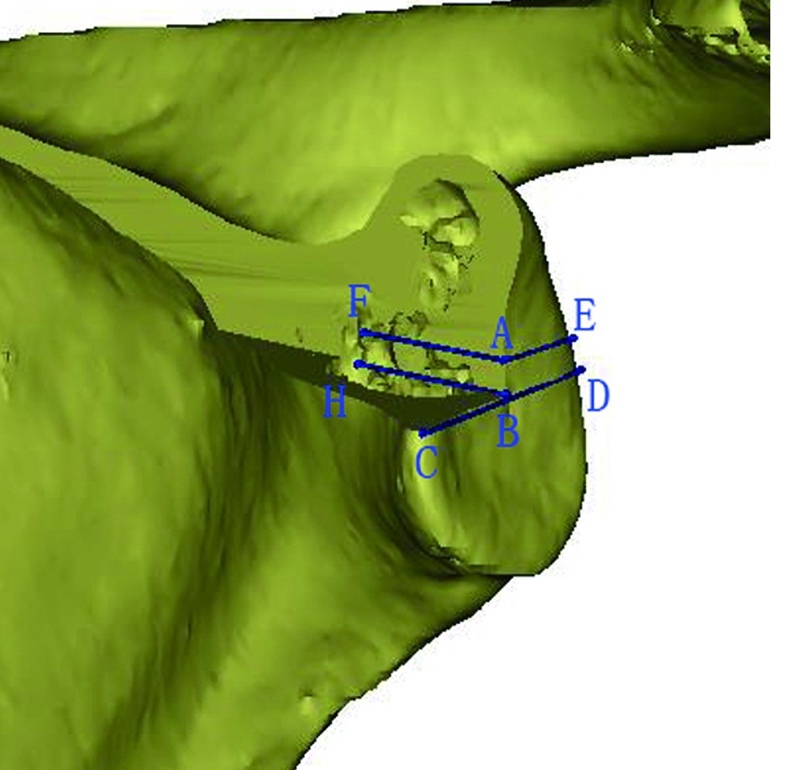 图7 肩胛盂体部深度、前后径的测量示意图。应用CT数据对肩胛骨进行三维重建(移除了肩胛盂体部前上部分),以肩胛盂上下极、前后缘的连线建立坐标系,测量肩胛盂体部深度和肩胛盂体部前后部宽度。图中线段AF、BH为肩胛盂中心和其上2mm肩胛盂体部深度;线段BC为肩胛盂体部前部宽度;线段AE、BD为肩胛盂体部后部宽度。线段AE、BD之间的距离为2mm,可对肩胛盂体部形态进行定量化分析