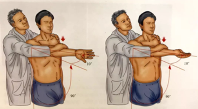 患者处于坐位或站立位,肩关节前屈90°,内收10-15°。使肩关节充分内旋,前臂完全旋前且大拇指朝下。此时向手臂施加向下的阻力,嘱患者对抗阻力尽力上举患肢。第二步使上臂旋外,掌心向上,再次施加阻力,,要求患者对抗阻力尽力上举患肢。如果第一个动作引起疼痛,第二个动作疼痛减少或消失即为阳性。