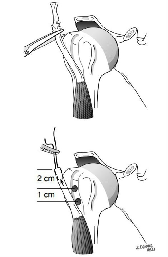 单纯切断术操作相对简单,但肌腱切断后有常伴有较高的“Popeye 畸形”发生率,因此该术式一般适用于高龄且对于运动要求较低的患者。肱二头肌长头肌腱切断结合固定术,即切断肱二头肌长头肌腱近端后将残端固定在结节间沟位置,可有效防止术后产生肌肉萎缩、挛缩痛,并可维持正常肌肉轮廓。手术同时需要治疗合并的盂唇损伤。术后6周逐步恢复运动。经过术后4~6个月的康复,能恢复损伤前的运动水平。