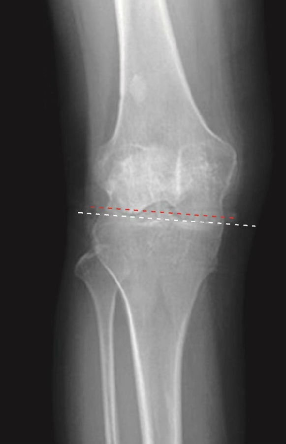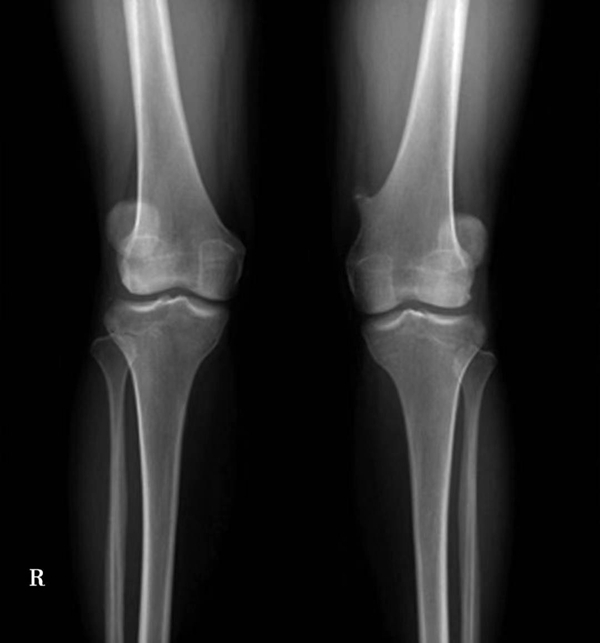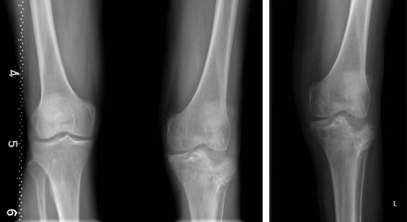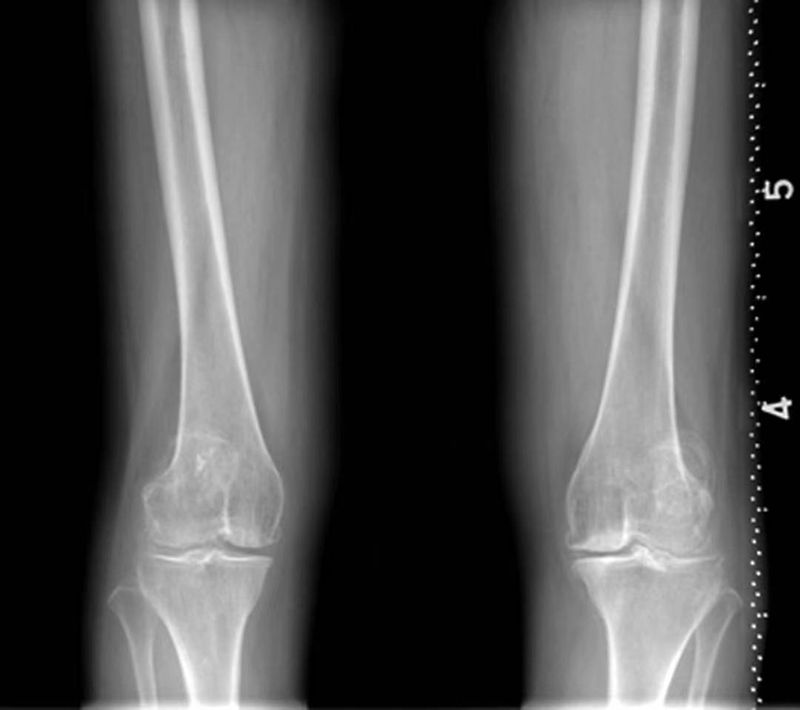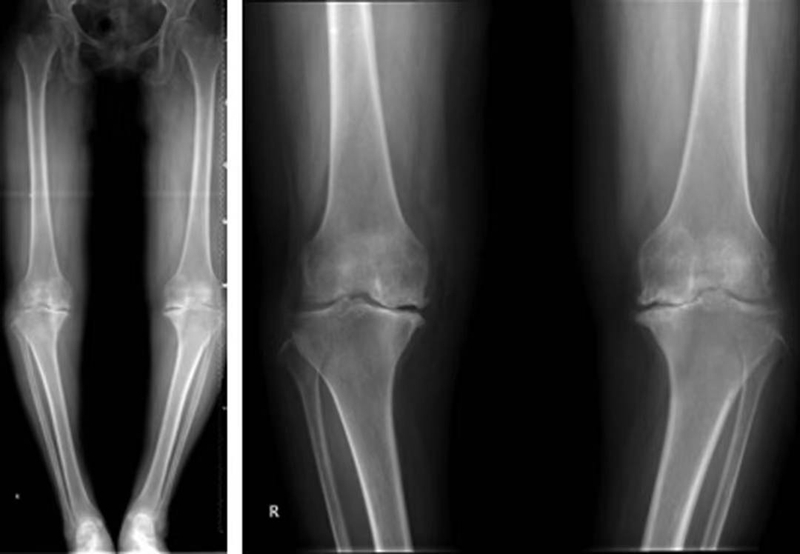 图12 双膝外翻,关节间隙不等宽,外侧较内侧窄。关节面可见骨质硬化