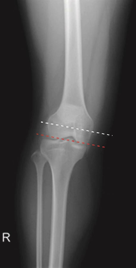 图6 高位髌骨的正位X线片,髌骨下极过高地位于两侧股骨髁最低点连线之上