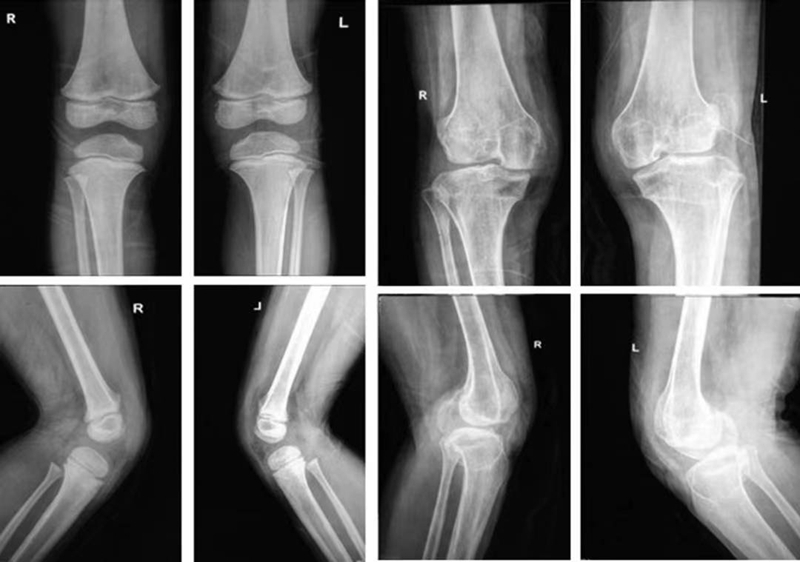 可以发现髌骨(图7~图9)和股骨-胫骨髁(图10)的发育不良、畸形及股-胫间隙变窄等异常(图11、图12)。