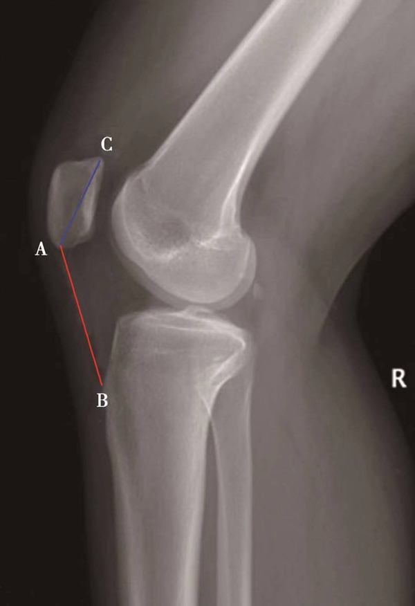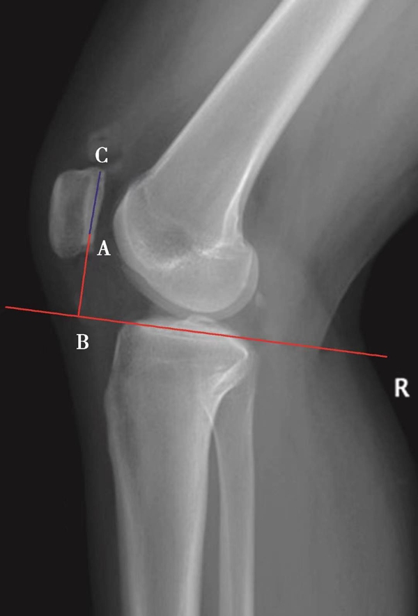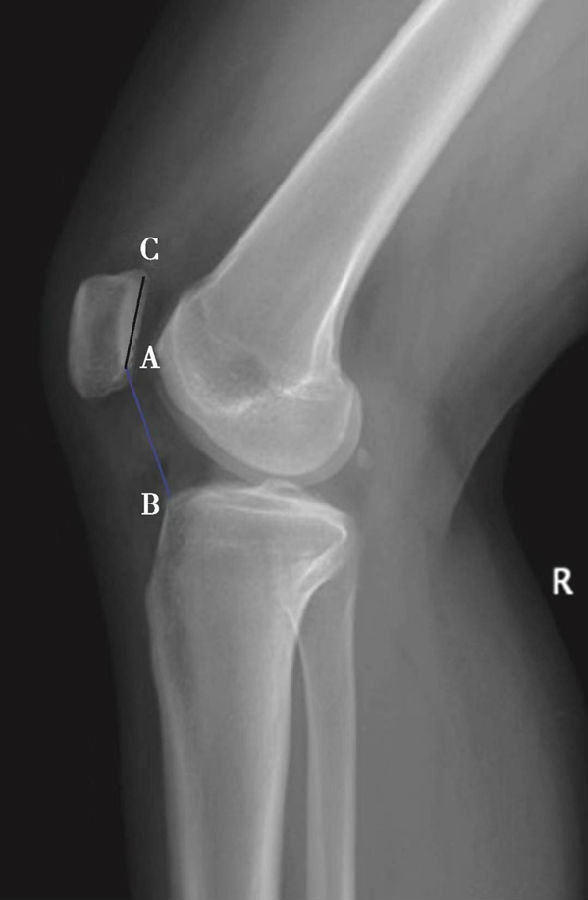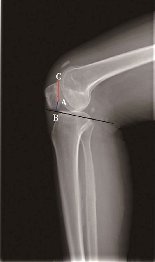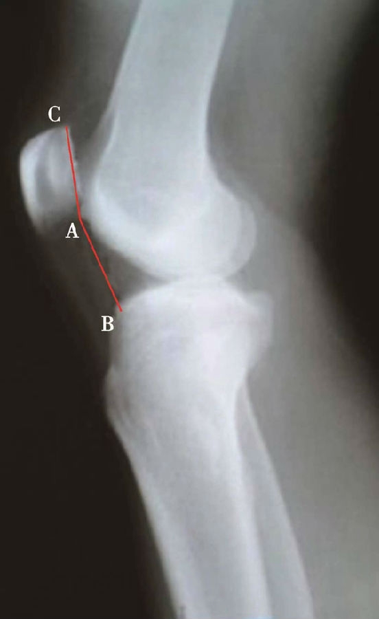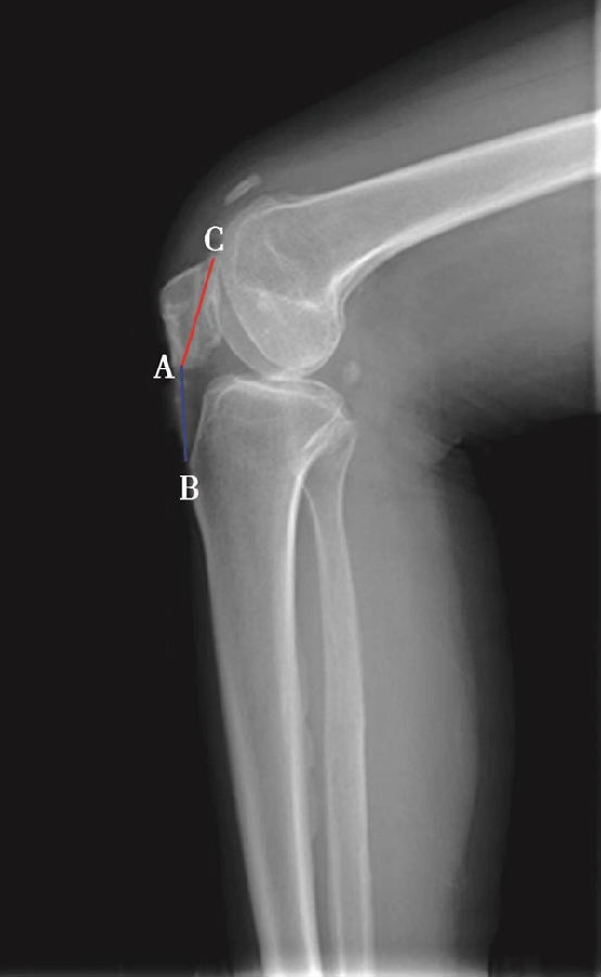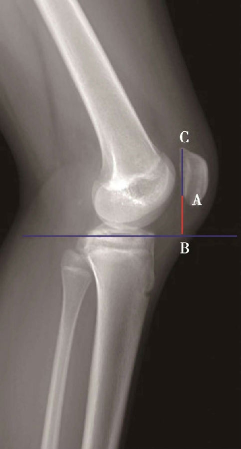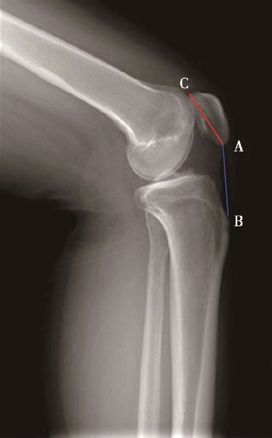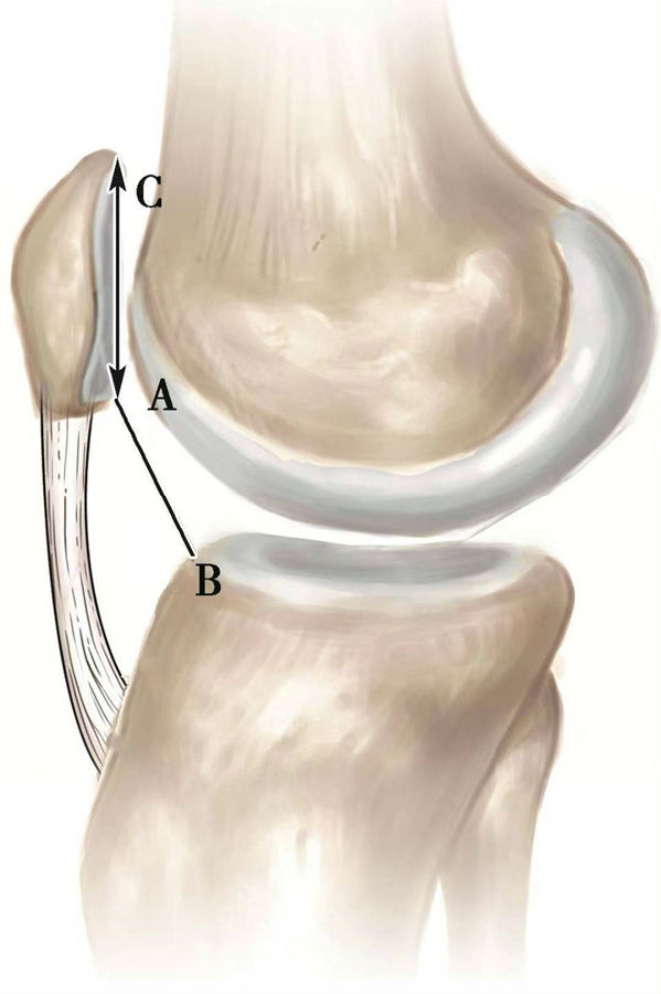 如图示:AB是髌韧带长度,AC髌骨纵轴长度。Insall-Salvati指数=AB/AC(图4)。