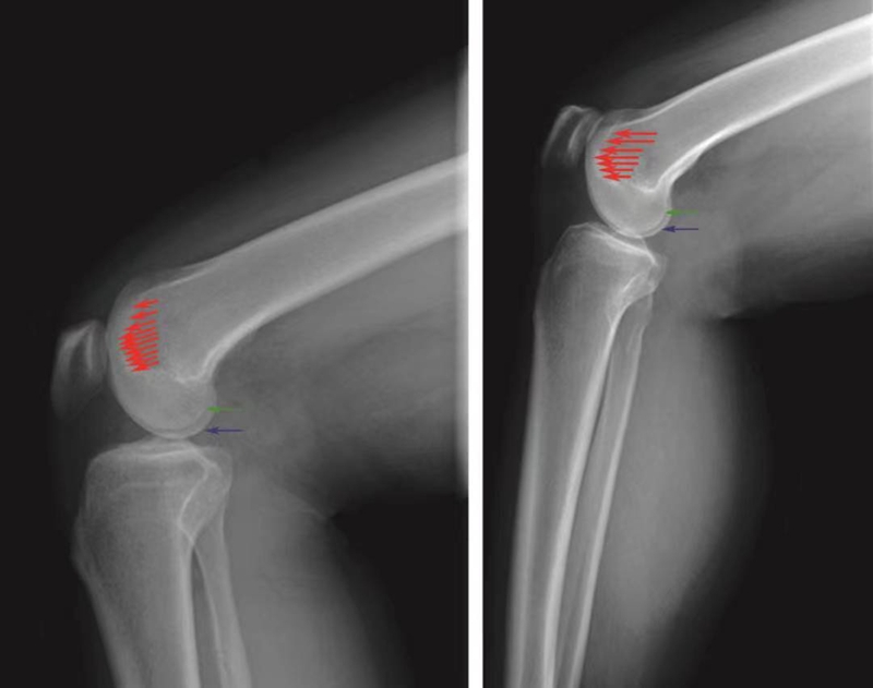 当膝关节处于完全伸直位时,由于股四头肌的收缩可能影响髌骨的位置,所以伸直位的膝关节侧位像对髌骨高度的评估可能不够准确。因此,我们在拍摄膝关节侧位像时通常嘱患者将膝关节屈曲到15°~20°。另外,一些患者能够使膝关节达到过伸状态,这种情况下所拍摄到的膝关节侧位像可以使原本正常的髌骨高度被误诊为髌骨高位。
