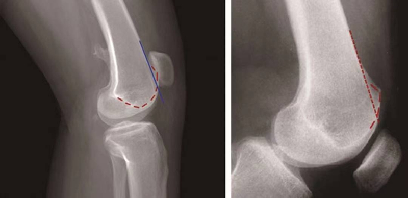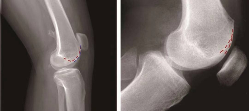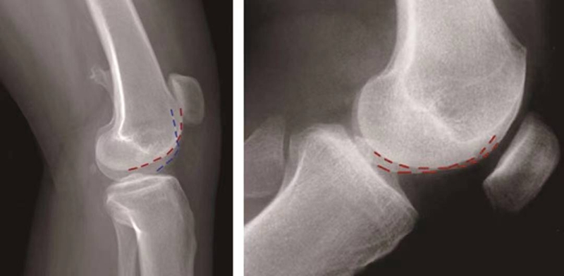 在标准的X线侧位片上,正常的膝关节滑车形态有以下3个特点(图10):①Blumenssat线延续为股骨滑车沟基底线,该基底线始终位于股骨髁轮廓线的后方,意味着股骨滑车沟低于股骨滑车的侧壁;②滑车沟基底线的最高点不超过股骨干前方皮质的延长线;③股骨内外滑车轮廓线几乎重叠,只显影为一条轮廓线。