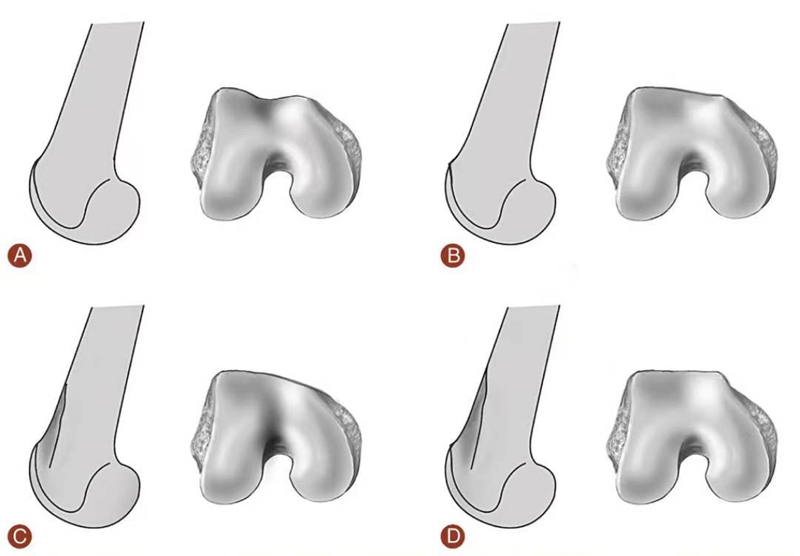 图14 股骨滑车发育异常分型 A型:交叉征;B型:交叉征+突起征;C型:交叉征+双线征;D型:交叉征+突起征+双线征