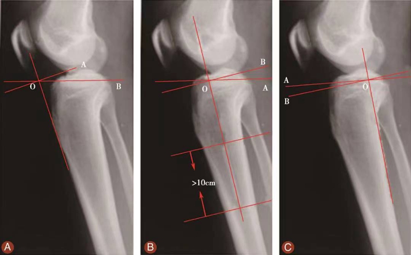 用量角器测量胫骨内侧平台前后缘连线分别与胫骨中上段前侧骨皮质切线的垂线(图15A)、胫骨结节下胫骨中上段轴线的垂线(图15B)以及胫骨后侧皮质切线的垂线(图15C)的夹角,即胫骨后倾角(∠AOB)