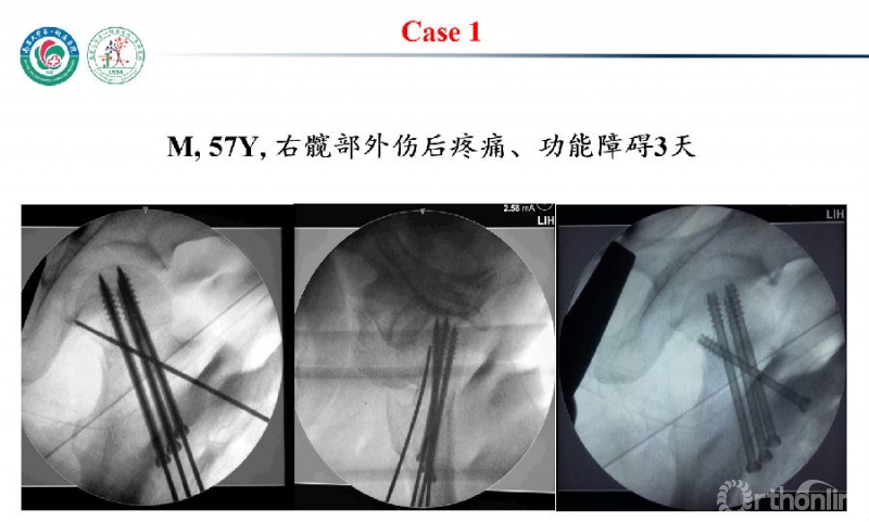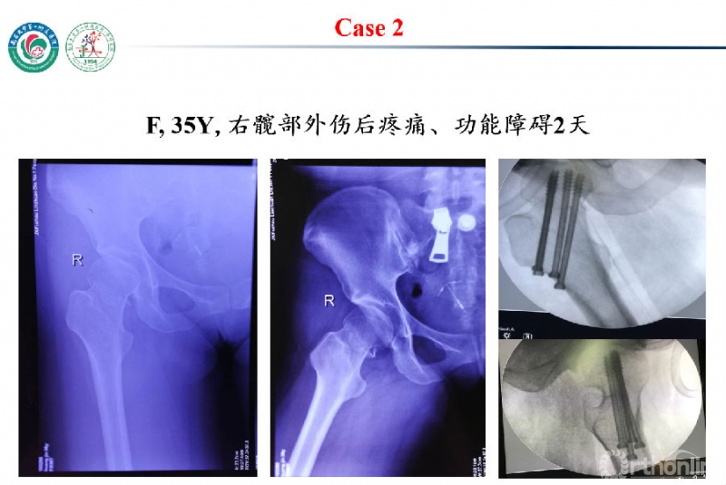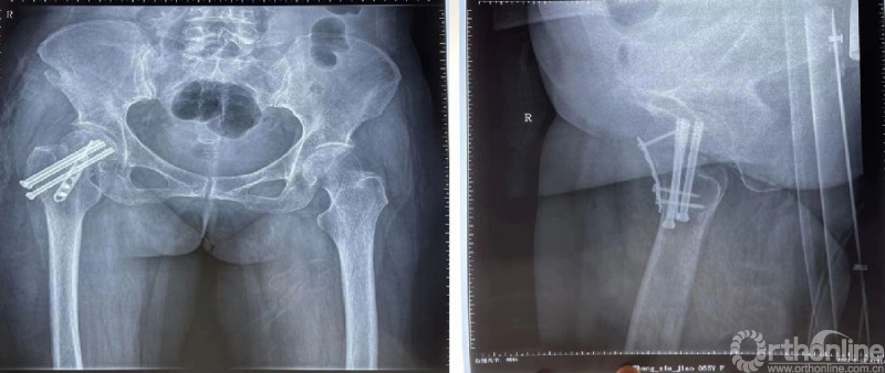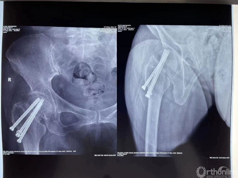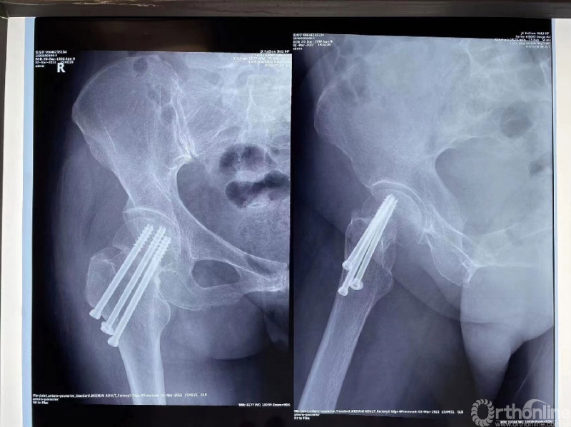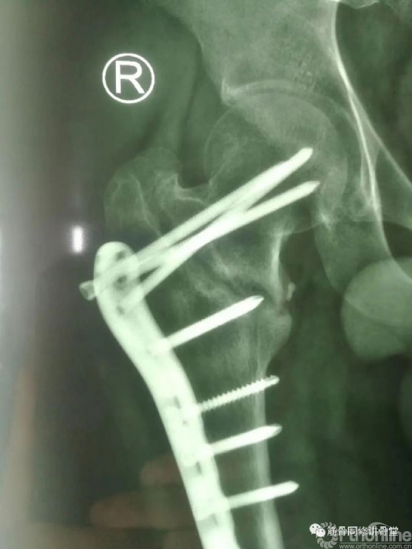 现病史:3月余前因外伤致右股骨颈骨折,于当地医院行闭合复位螺钉内固定术,术后3个月右髋部活动时疼痛明显,右髋关节活动受限。