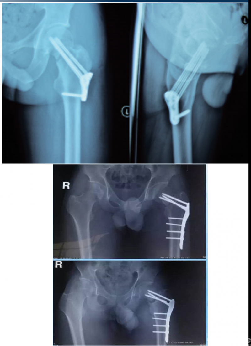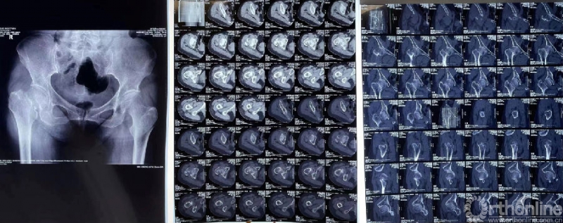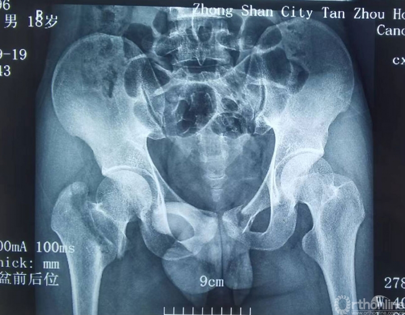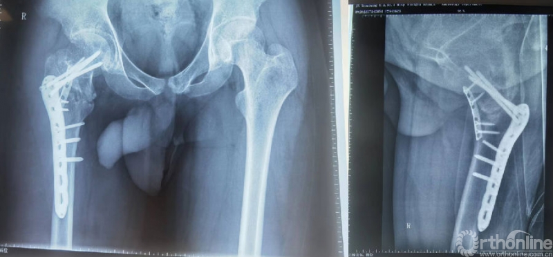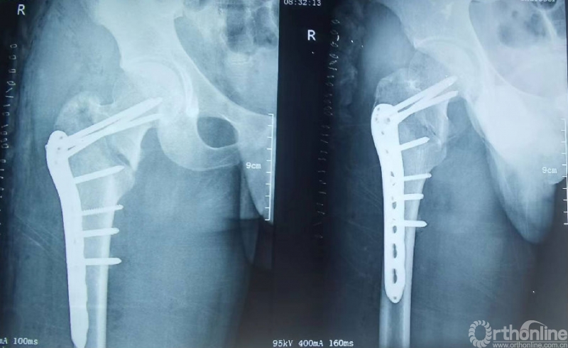 现病史:10月余前因外伤致右髋部骨折,于外省某医院行切开复位钢板内固定术,术后近1年因右侧髋关节疼痛不敢下地行走,患侧髋关节活动受限。