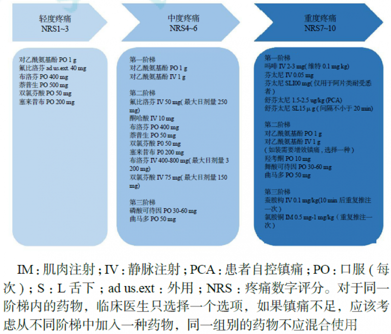 对于意识清醒、病情较轻的患者,以口服或局部非甾体类抗炎药为主;而对于病情较重或者中、重度疼痛患者,可通过肌注、静脉注射给予阿片类镇痛药物以及氯胺酮(图1)[10]。