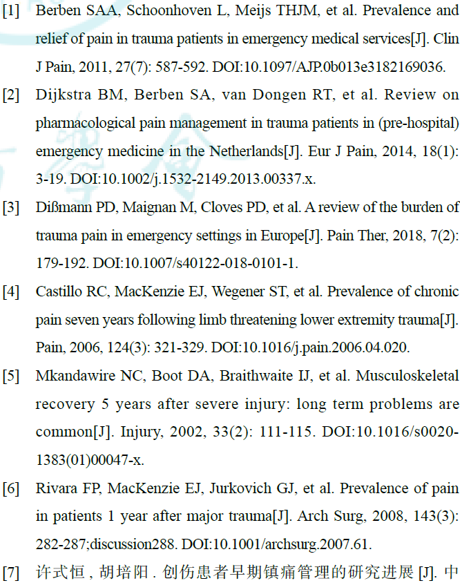 创伤(trauma)是急诊科常见疾病,主要表现为伤处的疼痛、肿胀、出血、畸形和功能障碍。近年来急诊科快速发展,大大提高了创伤患者的存活率,但是对于创伤患者的疼痛管理仍重视不足。