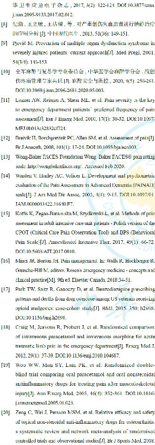 疼痛是急诊患者常见主诉,其疼痛发生率为52%~79%,其中创伤患者约占疼痛患者的20%,其入院时数字疼痛评分约为6分[1]。创伤患者在急诊科得到的治疗大多为创伤的控制治疗,而较少有针对疼痛管理的治疗,这导致疼痛在急诊科没有得到充分有效的治疗。