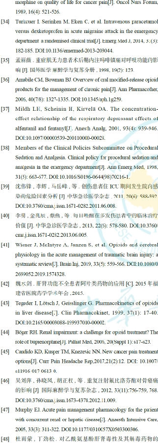 大部分镇痛药物都需要经过肝脏代谢,经肾脏排泄,因此,肝肾功能不全时,可影响镇痛药物的代谢,易引起药物体内蓄积而发生毒性反应[42-43]。部分镇痛药物可引发肝肾功能损伤,应避免使用。对于此类创伤患者,需减少吗啡、芬太尼、NSAIDs的用量、延长用药间隔[44-46]。避免使用哌替啶、乙酰氨基酚等可能引起药物蓄积或加重肝肾功能损伤的药物[47-48]。