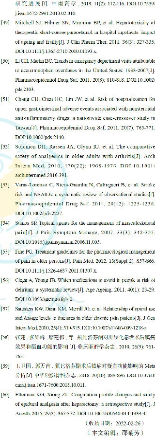 目前关于老年患者镇痛相关的研究较少。有限的数据表明,对乙酰氨基酚对健康老年人的影响较小,但体弱的老年人使用对乙酰氨基酚比一般成年人发生肝毒性的可能性更大,尤其是营养不良、肝功能异常、长期饮酒的老年患者可能要求降低剂量[49-50]。关于NSAIDs,老年人出现NSAIDs引起胃肠道出血和肾功能损伤的风险更高[51-52],同时还可增加不良心血管事件的风险[53]。阿片类药物会增加老年患者谵妄/骨折风险,针对中重度疼痛且使用非阿片类镇痛药物无法缓解的患者,应谨慎使用,尽量避免使用长效阿片类药物。