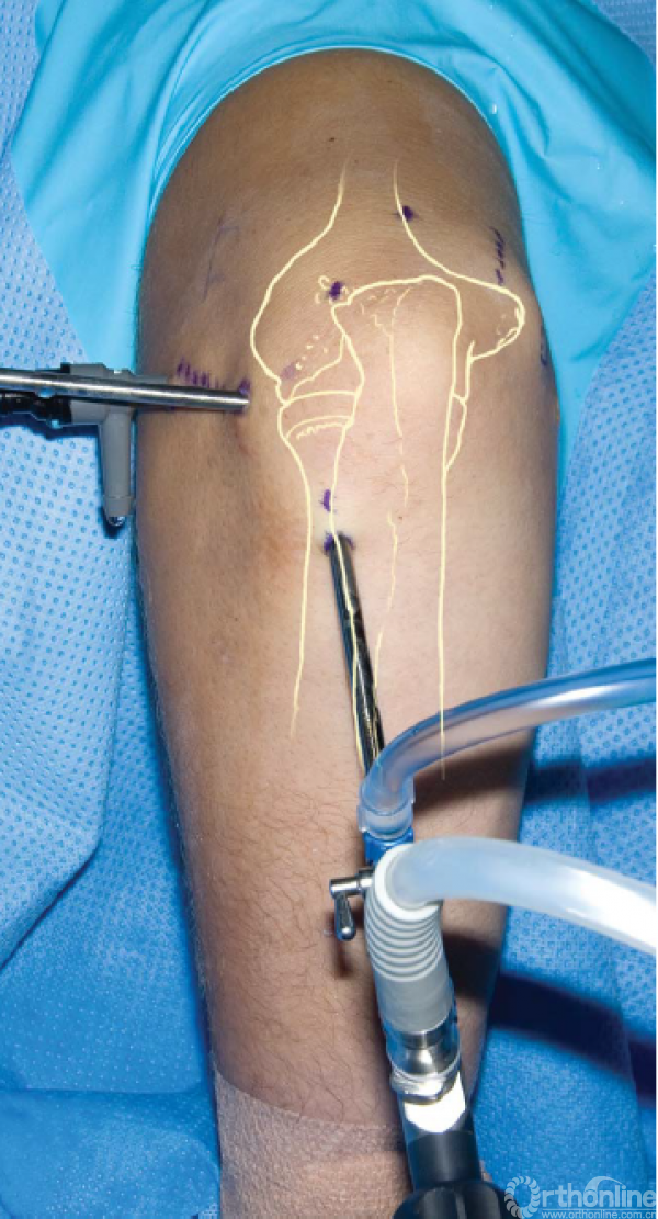 可使用标准膝关节镜器械,如30°4.5毫米关节镜。实心非环形鞘管十分有用,因为环形鞘管允许液体从关节囊和工作区域溢出到软组织中。在手术过程中使用标准的关节镜咬合器、把持器、磨钻和刨刀。通常不使用负压刨刀,因为即使关闭负压,刨刀管中仍然存在一定负压。可按需使用牵开器。