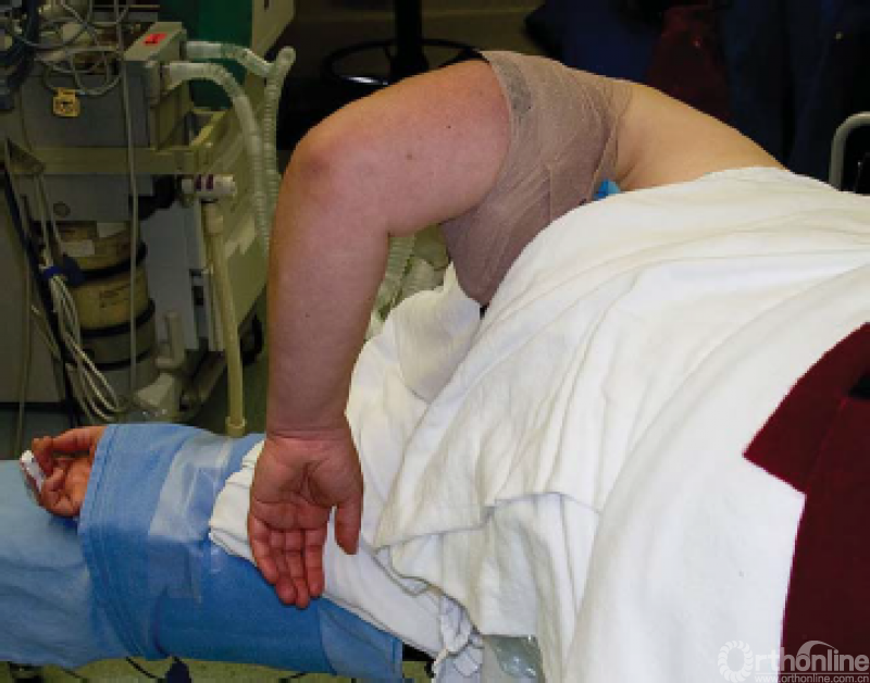 在手术开始前标记入路、骨和软组织标志,包括肱桡关节、内外上髁、肌间隔和鹰嘴,液体流出会影响这些结构的触诊。标记尺神经的位置,并注意尺神经半脱位。