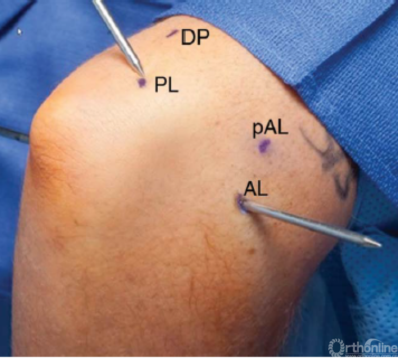 图2 肘关节镜入路外侧观:DP:直接后方入路;PL:后外侧入路;pAL:近端前外侧入路;AL:前外侧入路