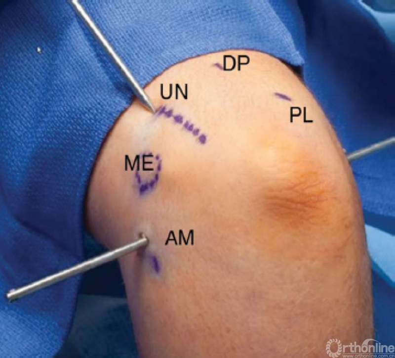 图3 肘关节镜入路内侧观:UN:尺神经;ME:内上髁;AM:前内侧入路;DP:直接后方入路;PL:后外侧入路