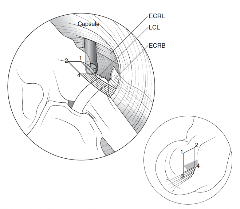 采用该入路的目的是允许器械向下到达肌腱起点,而不是通过 ECRB 肌腱本身进入关节。去除外侧滑膜,然后松解外侧关节囊。偶尔会发现肱骨侧关节囊破裂。更常见的是,尽管可能存在小的线性撕裂,但关节囊是完整的。使用单极电极更容易分层松解外侧软组织。从肱骨切开或松解关节囊,当它向远端回缩时,ECRB肌腱可见于后方,而ECRL(主要为肌性)则更靠前。