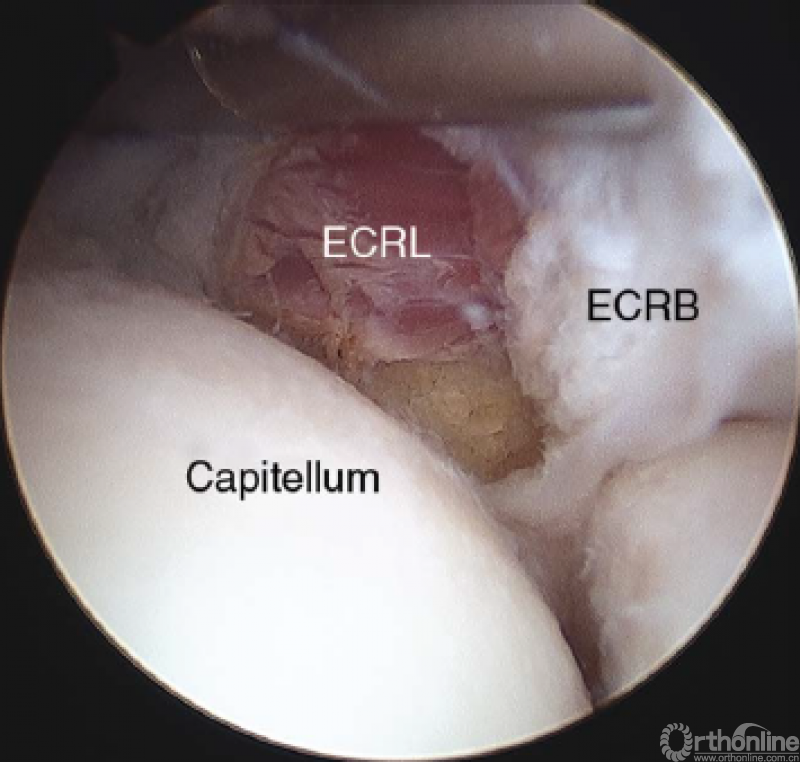 对于关节镜治疗,了解肱骨外上髁伸肌腱起点的解剖十分重要。ECRB肌腱起点的位置可通过关节内标志确定。在肘部,桡侧腕长伸肌(ECRL) 覆盖ECRB的近端部分,因此必须向前掀起ECRL才能看到ECRB表面,一层疏松结缔组织将这两个结构分开。