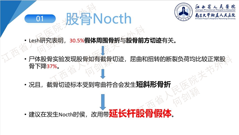 有文献报道,尸体实验发现Nocth切迹会使膝关节周围扭曲,屈曲扭转的断裂负荷较正常股骨下降37%,容易沿应力交界处发生短斜形骨折。所以建议在发生Nocth时,尽量改用延长杆,增加股骨假体的轴内力学稳定性。