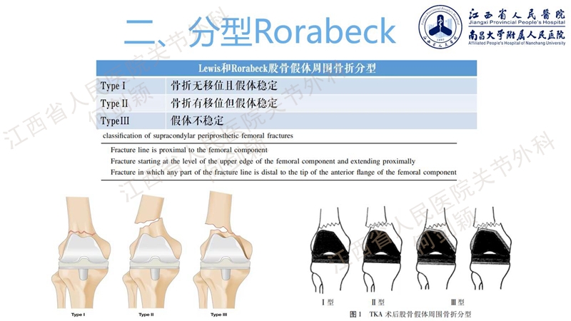 根据文献,股骨假体周围骨折分型常使用Rorabeck分型,Ⅰ型是骨折无移位,假体稳定;Ⅱ型是骨折有移位,但假体稳定;Ⅲ型是骨折累积的髁间假体不稳定,髁间假体之间存在松动。