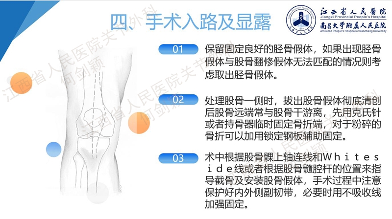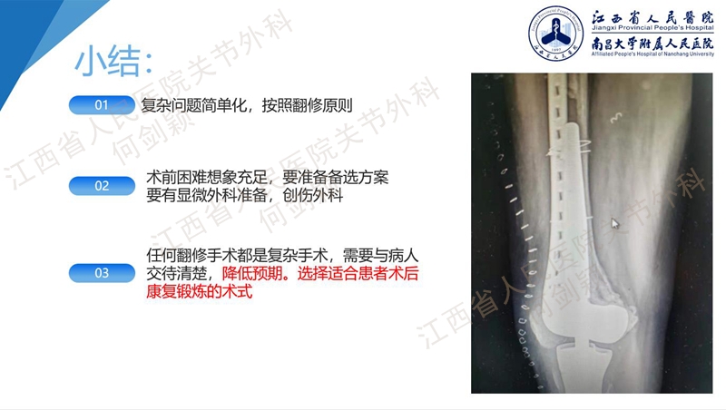 最后,小结一下,任何一种膝关节翻修手术,都要遵循复杂问题简单化处理的方案。术者采用最熟悉的术式,最简单化的操作,对病人的功能最小干扰,获益最大的方法,我们称之为简单化方案。术前的困难想象要充足,要准备备选方案,做翻修手术可能要有显微外科的准备、创伤外科的基础,任何翻修手术都是复查手术,需要与病人交代好清楚,降低预期,选择适合患者的最佳翻修手术方案。