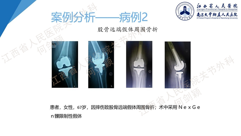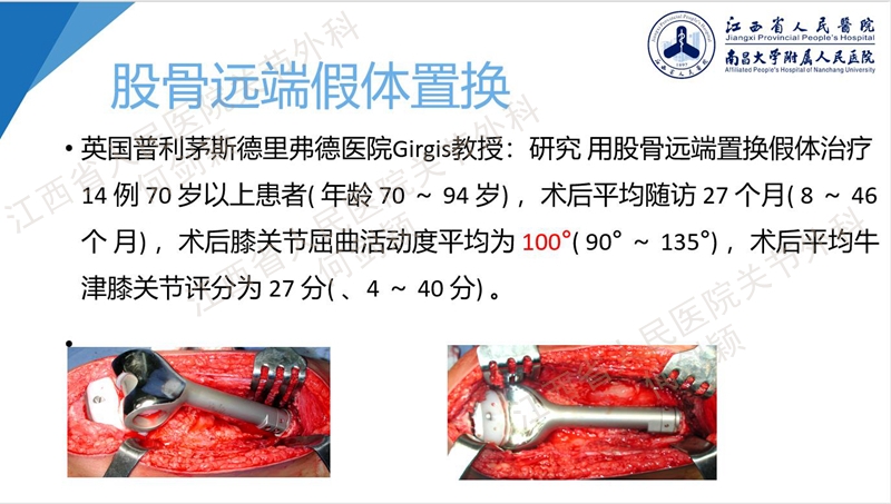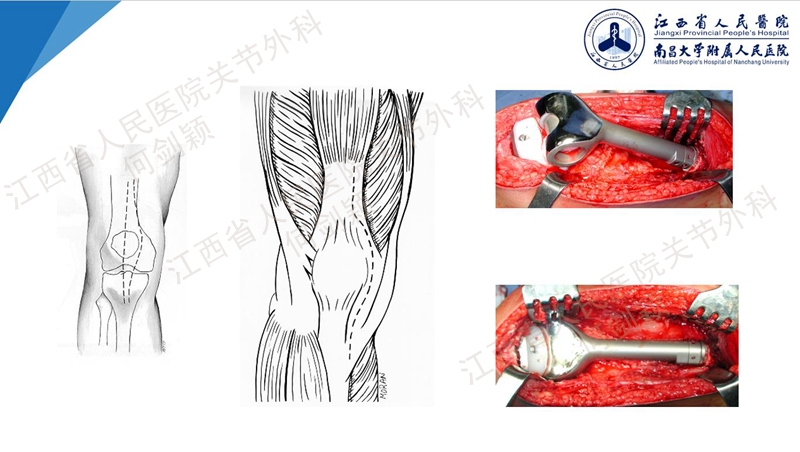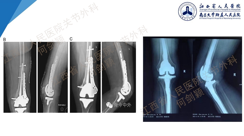 也有使用髁间股骨远端髓内钉联合锁定钢板的方案,也可以使用NexGen髁限制性假体。使用NexGen假体,前提是假体松动,必须先使用克氏针或是临时固定,方便给予植入髓内固定延长,置入后经过植骨或交叉稳定或骨水泥技术,方便长入。
