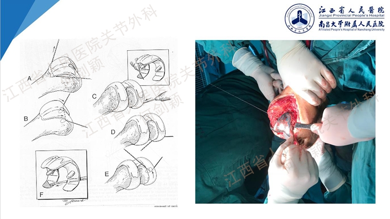 有时受限于假体器械和尺寸影响,术中截骨前脸截的会多一点,以笔者经验,截骨时可以从内侧开始,以内侧为参照,或用香蕉片刮刀去比对,如果内侧截骨切迹很厚,那么要上移调整截出钢琴面,通常是外侧斜面60°到70°。