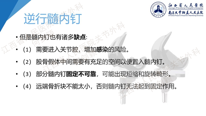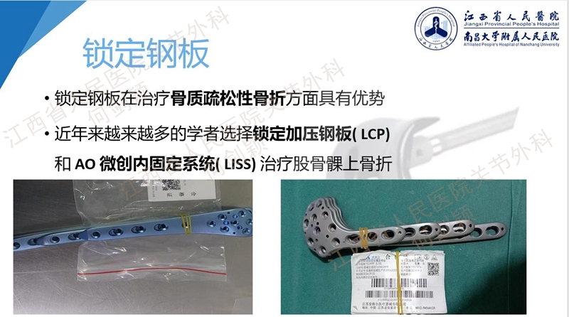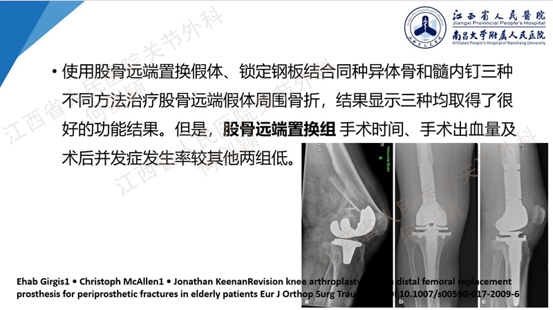 英国普利茅斯德里弗德医院的Girgis教授的一项研究表明:髓内钉固定、锁定板固定和股骨远端假体固定三种方式固定在出血量、术后功能、疼痛、术后并发症等方面无明显差异。