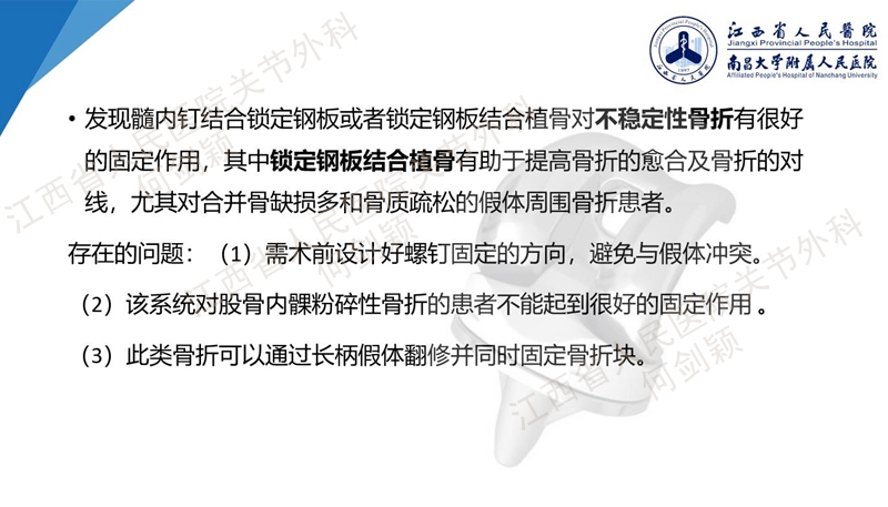 当假体不稳定无移位的Ⅲ型或有移位的Ⅳ型,且骨质比较差,那么可以选择带柄的假体翻修联合锁定钢板内固定联合植骨。当骨折Ⅳ型,且髁间有移位,那么不论骨质好坏都可以选择带柄的假体翻修一体植骨或是定制型股骨远端假体。
