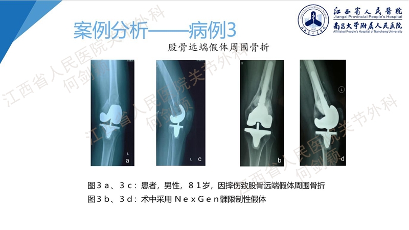 病例2、病例3,使用NexGen髁限制性假体植入,联合使用大量骨水泥填充髁间,稳定固定,术后长期疗效有待随访评估。