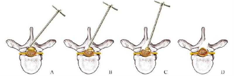 患者侧卧使病变部位朝上,臀部固定,腰部和腋下垫枕,其余同俯卧位。C形臂X线定位手术节段,精确定位后在体表标记进针点,通常为棘突中线旁开5~8cm,局麻麻醉注射,应用长局麻针头逐层注射麻醉药物,到达关节突关节背侧。尖刀切开1cm左右纵行切口,钝性导杆沿切口置入,由背侧逐步向腹侧探查,当尖端探查到椎板外侧边缘或关节突关节部位骨质时候,再向腹侧探查,当有落空感时,向背侧收回,将导杆紧贴椎板外侧边缘或关节突关节部位骨质放置,再次进行透视确认导杆位置和节段的正确性,可观察到导杆与脊柱矢状面成角50°~70°。