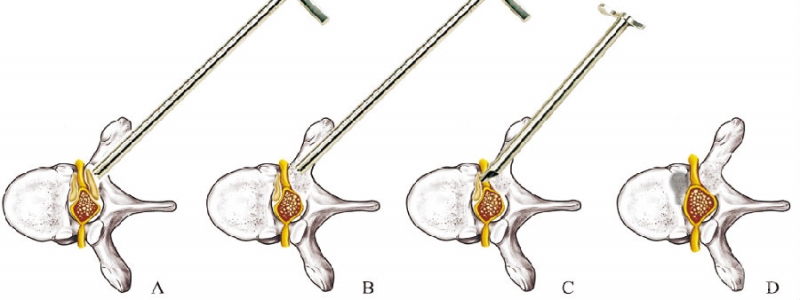 正位X线位于棘突根部,侧位在椎板背侧。经工作通道置入内镜系统,顺棘突根部向头尾端分离椎板背部的肌肉,暴露出上下椎板交界部位,叠瓦状关节突椎板下缘处,暴露椎板背部骨质和黄韧带背侧,由此处开始减压。在工作通道内置入镜外锯齿状环锯,开始逐级锯除椎板和棘突根部骨质,用钳子将游离的骨质取出,用钳子和射频去除黄韧带和软组织,直至到达头尾两端正常椎板和硬膜囊结构,而后再向对侧逐步扩大减压空间,沿棘突根部越过中线和黄韧带背侧,锯除对侧的椎板和黄韧带,到达对侧硬膜边缘。