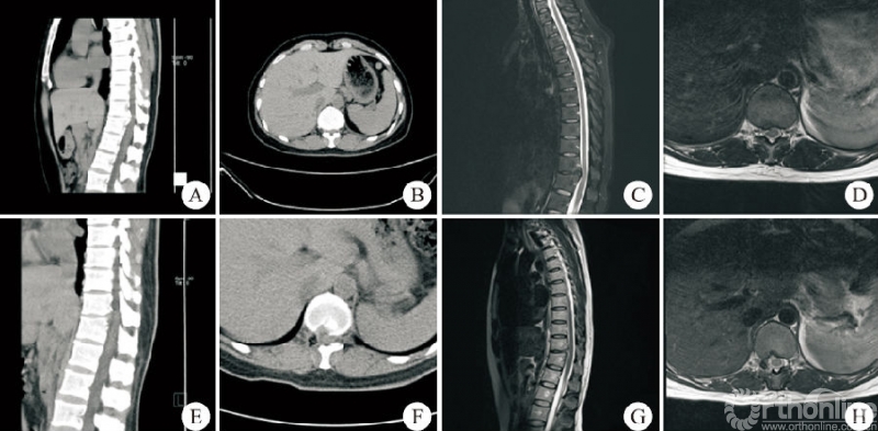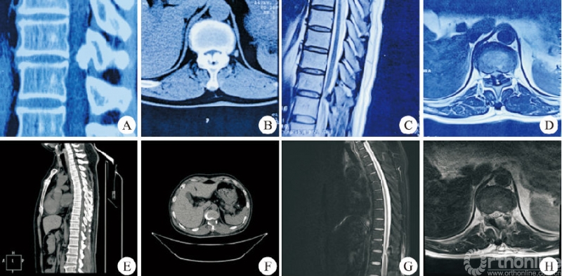男,46岁,T11−T12黄韧带骨化合并椎管狭窄,行俯卧位经皮内镜可视化环锯椎管减压术。A、B:术前CT矢状位和横断位示T11−T12融合型黄韧带钙化;C、D:术前MRI示脊髓严重受压合并信号改变;E、F:术后CT矢状位和横断位示钙化的黄韧带完全去除椎板充分扩大减压;G、H:术后MRI示脊髓不受压硬膜完全鼓起。图3 T11−T12俯卧位胸椎后入路术前与术后影像学资料