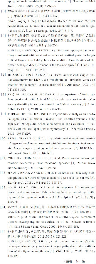 总之,经皮内镜可视化环锯治疗TSS能获得令人满意的临床疗效,能够对椎管进行充分减压,降低了手术相关并发症的发生,提高了手术的安全性,达到了真正的微创手术的要求。但本研究中病例随访时间短,其长期疗效仍需长期随访和多中心临床病例研究进行验证。