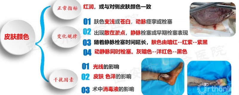 (1)静脉危象:动脉血供旺盛。皮肤返红较正常速度明显快,创面渗血多,肤色较正常红,逐渐颜色加深。应对方法:受区寻找皮下静脉,吻合小隐静脉近端/皮下静脉(外减压)。