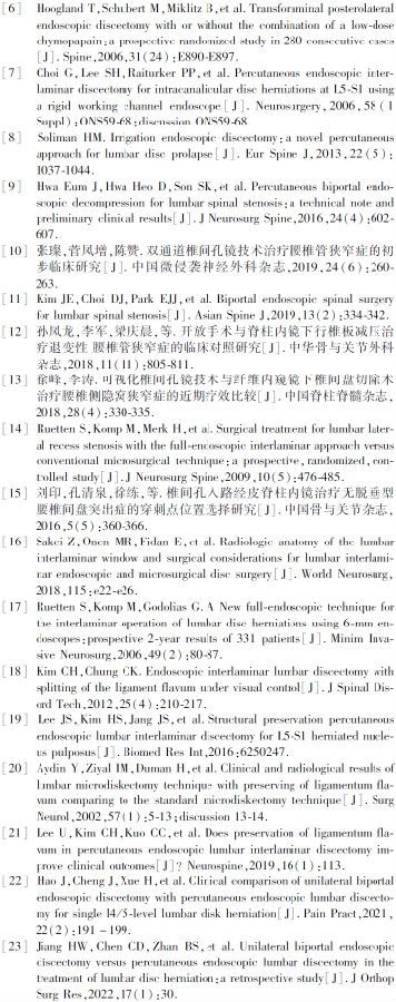 有学者对两种技术进行了对比研究,Hao等[22]回顾性分析了2018~2021年通过内镜治疗的单纯L4-5间盘突出症病人40例,其中20例行UBE手术,另20例行单通道脊柱内镜手术,尽管两组病人临床疗效近似,但在术中出血量、手术时间、术后住院时间和短期术后疼痛方面,单通道组优于UBE组。Jiang等[23]回顾性分析了54例通过内镜治疗的单节段间盘突出病例,UBE组24例、单通道内镜组30例,认为UBE治疗腰椎间盘突出症在临床效果、疼痛控制与病人满意度上与单通道内镜组相似,但较单通道内镜组术中出血与术后隐性失血增加、手术时间及住院时间更长、医疗总费用更高。