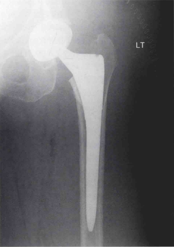 图2 初次全髋关节置换术后左髋侧位X线片,显示股骨近端一处可疑无移位骨折