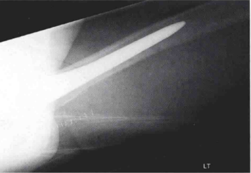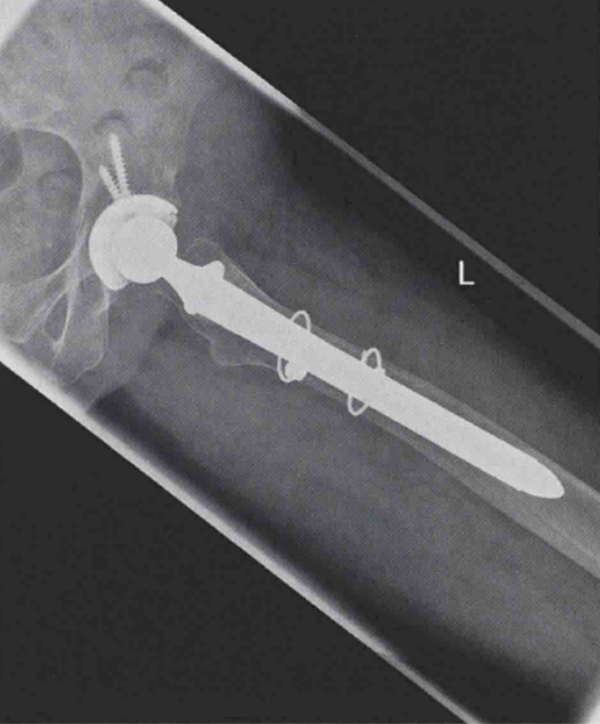 B2(无移位股骨干骨折):大部分此类骨折在术后X线片上才被发现。因此患者常常被要求限制负重。但若是出现柄末端附近的短斜型或横断骨折这类不稳定骨折,最好是按B3型骨折那样来处理。如果在术中就发现骨折,通常可使用钢丝或钢缆进行环扎固定。